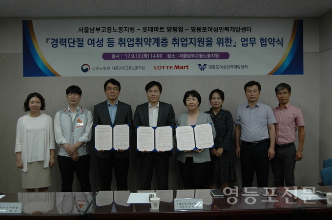 [영등포신문=신예은 기자] 고용노동부 서울남부지청은 12일 대규모 쇼핑몰 입점과 관련해 경력단절 여성 등 취업취약계층 취업지원을 위해 롯데마트 양평점, 영등포여성인력개발센터와 업무협약을 체결했다.