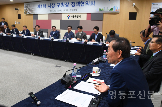 제1차 '시장-구청장 정책협의회는 박원순 서울시장과 22개 자치구청장이 참석한 가운데 약 2시간에 걸친 회의를 통해 서울 전지역 도시재생뉴딜 사업지 선정 배제에 대한 대응방안, 지방분권관련 국고보조금 기준 보조율 차등 적용 개선에 관해 논의했다.