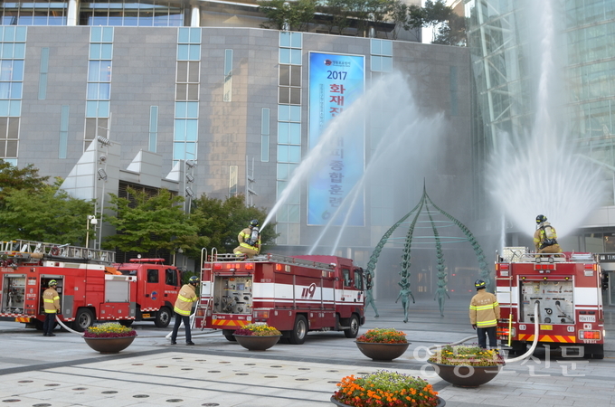 이날 화재진압 대피훈련은 가상시나리오에 따른 화재발생 및 대피훈련으로 메리어트호텔 4층 미팅룸에서 전기적 요인으로 화재가 발생해 연소가 확대되고 다수의 인명피해가 발생됨에 따른 자위소방대의 옥내소화전을 이용한 초기화재진압법과 소방대원들의 현지적응훈련, 화재발생시 대피요령의 순으로 진행됐다.