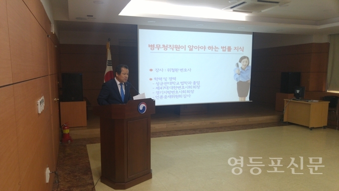 [영등포신문=신예은 기자] 서울지방병무청(청장 황평연)은 지난 14일 제47대 대한변호사회장인 위철환 변호사를 초빙해 '병무직원이 알아야 하는 법률지식'이라는 주제로 교육을 실시했다.