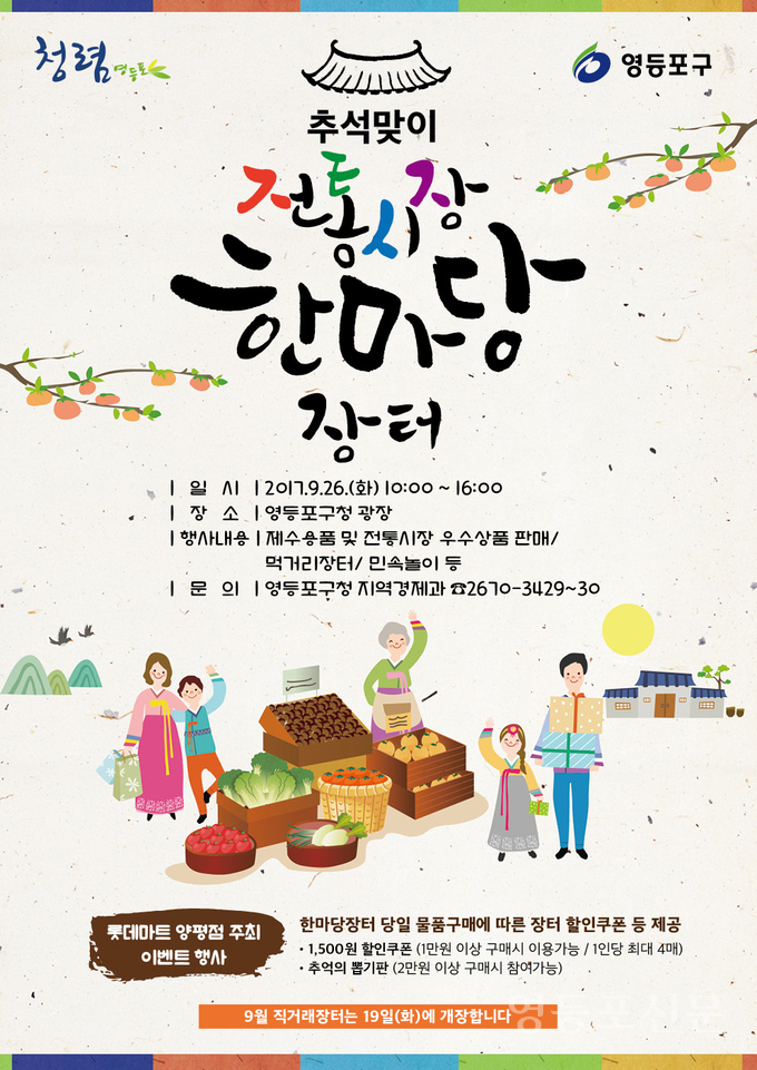 [영등포신문=양혜인 기자] 영등포구가 추석을 앞두고 ‘전통시장 한마당 장터’과 시장별 ‘전통시장 이벤트’를 통해 주민들의 장바구니 부담 덜기에 나섰다.