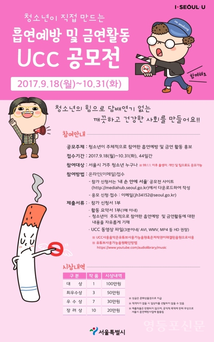 청소년의 자발적인 참여로 진행하는 학교 안팎의 흡연예방·금연 활동을 장려하고 홍보하기 위해 9월 18일부터 10월 31일까지 청소년이 직접 만든 흡연예방, 금연활동 홍보 UCC 공모전을 개최한다.