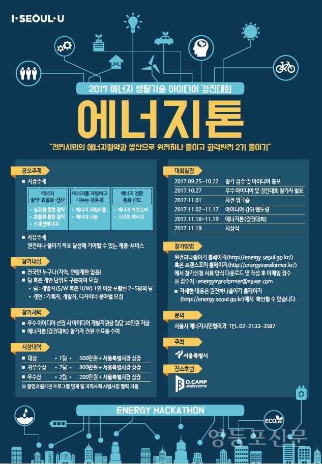 [영등포신문=이현숙 기자] 서울시는 시민들의 에너지생활기술 아이디어를 발굴해 에너지절약문화를 확산하고 친환경 일자리 창출에 이바지하고자 에너지생활기술 아이디어 경진대회 ‘에너지톤’을 개최한다. ‘에너지톤’은 에너지와 관련된 각종 아이디어를 발전시키고 실제 서비스로 구현해 보는 개발 마라톤이다.