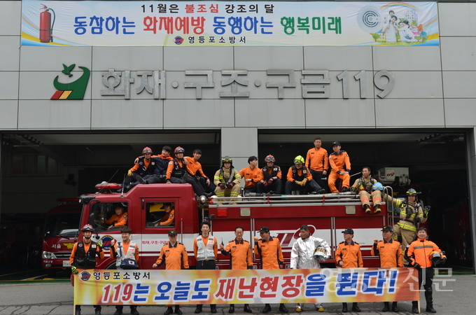 [영등포신문=신예은 기자] 영등포소방서(서장 이귀홍)는 7일 오전 10시 본서 차고 앞에서 영등포관내에 재난 발생 시 선봉장으로 달려가는 주력, 소방펌프차량을 중심으로 화재진압, 구조, 구급대원 및 행정직원들이 한데 어우러져 이틀 후 있을 9일 소방의 날을 기념하며 자체적으로 사진 행사를 가졌다.
