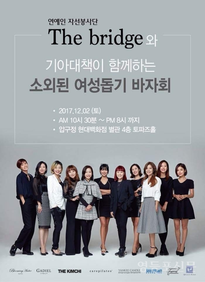 [영등포신문=나재희 기자] 만능 엔터테이너 김예분과 슈퍼모델 박둘선이 속해있는 연예인 자선 봉사단 '더 브리지'와 기아대책이 함께하는 바자회가 가 12월 2일 오전 10시 30분부터 오후 8시까지 압구정 현대백회점 별관 4층 토파즈홀에서 열린다.