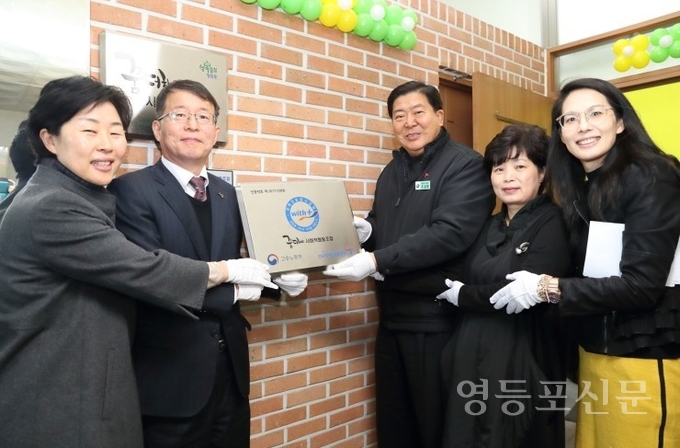 [영등포신문=함창우 기자] 조길형 영등포구청장(오른쪽에서 세 번째)이 24일 오전 자원순환센터 내 장애인 표준사업장에서 현판을 들고 기념 촬영을 하고 있다. 꿈더하기사회적협동조합 장애인 표준사업장은 한국마사회의 후원으로 발달장애인의 지역사회 자립을 위해 마련된 공간으로 지난 11월 10일 장애인 표준사업장이 한국장애인고용공단의 인증을 받았다.