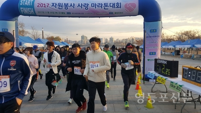 [영등포신문=신예은 기자] 자원봉사의 날의 기념하는 제13회 자원봉사사랑 마라톤대회가 11월 25일 여의도 이벤트 광장에서 개최되었다. ‘열린사회자원봉사연합’, ‘한국마라톤TV’, ‘대한직장인 체육회 마라톤협회’가 주최하고 ㈜모두투어가 후원하는 이번 대회는 풀, 하프, 10km, 5km, 4가지 종목으로 마라톤과 자원봉사를 사랑하는 사람들이 성별에 관계없이 약 2,000명이 참여하였다