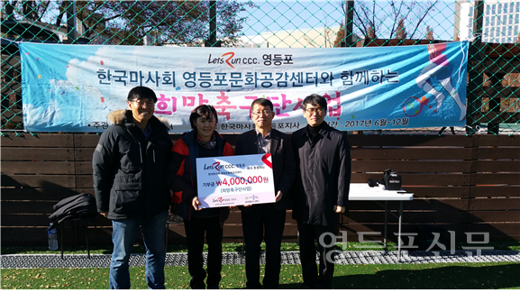 [영등포신문=신예은 기자] 한국마사회 영등포문화공감센터(지사장 이용선)는 지난 30일 (사)광야홈리스센터(원장 정경화)에 청년노숙인 자활사업 지원을 위해 기부금 400만원을 전달하였다.