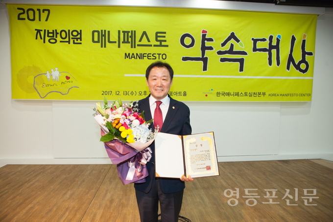 [영등포신문=함창우 기자] 영등포구의회 김용범 의원(영등포동, 당산2동)이 13일 영등포아트홀에서 열린 ‘2017 지방의원 매니페스토 약속대상’ 시상식에서 공약 이행 분야 우수상을 수상했다.
