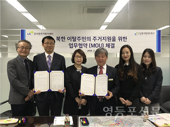 [영등포신문=함창우 기자] 한국토지주택공사(LH) 강서권주거복지센터(센터장 배문호)는 지난 달 20일 ㈜아시안허브(대표 최진희)와 다문화가정의 주거지원을 위하여 상호 협력하는 업무협약(MOU)에 이어 28일에는 (사)남북사랑네트워크(이사장 안인섭)와 북한이탈주민의 주거지원을 위한 업무협약(MOU)을 체결했다고 밝혔다.