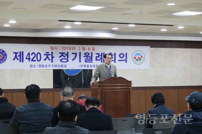 [영등포신문=함창우기자] 민족통일영등포구협의회(회장 김용숙)는 8일 오전 구청 지하상황실에서 유태전 지도원장을 비로한 임원 및 회원들이 참석한 가운데 제420차 정기 월례회의를 개최했다.