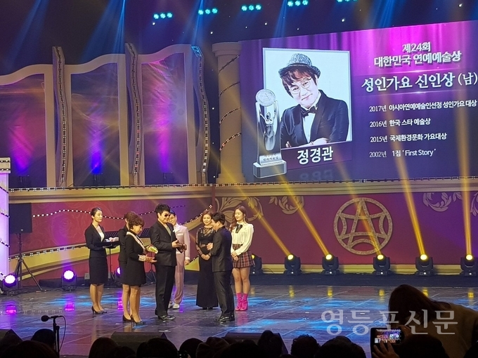 [영등포신문=신예은 기자] '몰라 몰라' 등 수많은 히트곡으로 지금의 자리까지 온 트로트 가수 정경관이 '제24회 대한민국 연예예술상' 에서 성인가요 부문 신인상을 수상하는 영예를 안았다. 올래 데뷔 10여 년 차가 넘는 내공이 탄탄한 가수이기도 하다. 그동안 정경관의 가수 활동으로 보면 중고 신인이지만 처음 음악활동은 성인가요가 아니다.