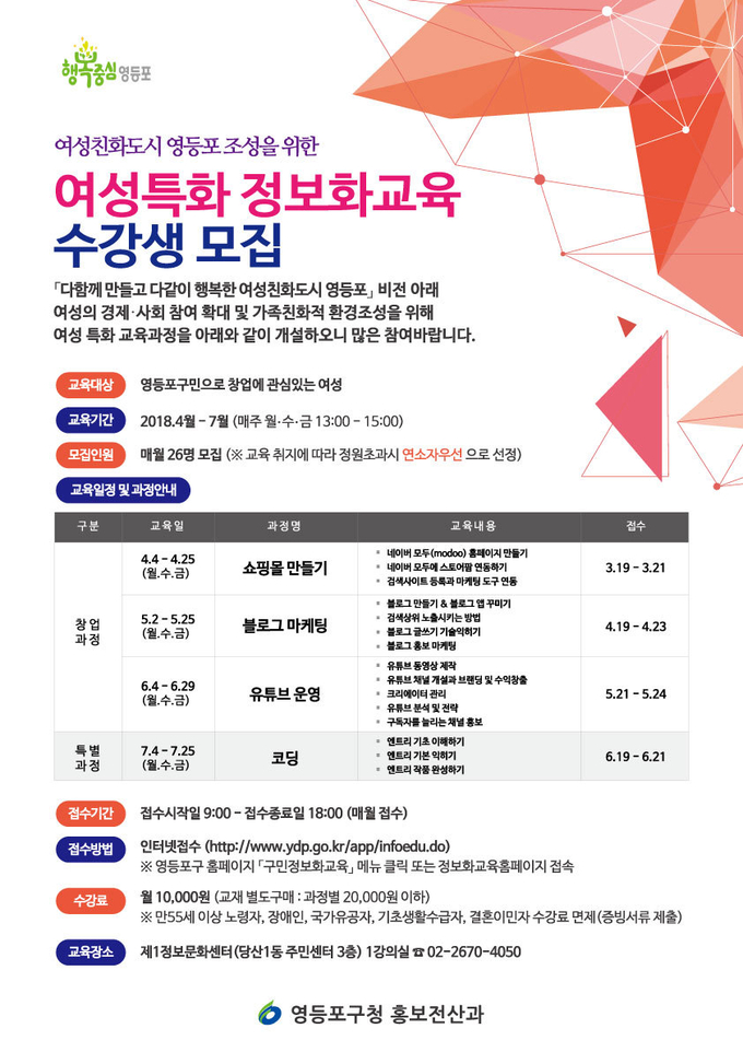 수강료는 월 1만원이며 매주 월, 수, 금요일에 제1정보문화센터(당산1동 주민센터 3층)에서 진행된다. 신청은 영등포구 정보화교육홈페이지(www.ydp.go.kr/app/infoedu.do)에서 하면 된다.