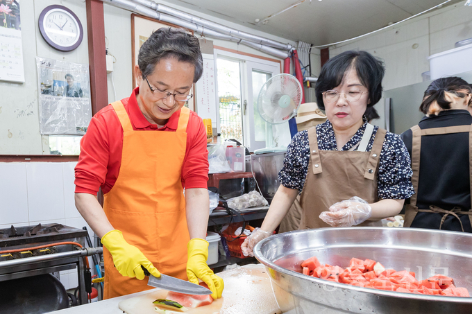 [영등포신문=이천용 기자] 최호권 영등포구청장(왼쪽)이 한 달에 한 번 나누는 기쁨, ‘자원봉사 day’를 맞아 1일 오전, 영등포동 쪽방촌에서 수박 화채를 만들었다.