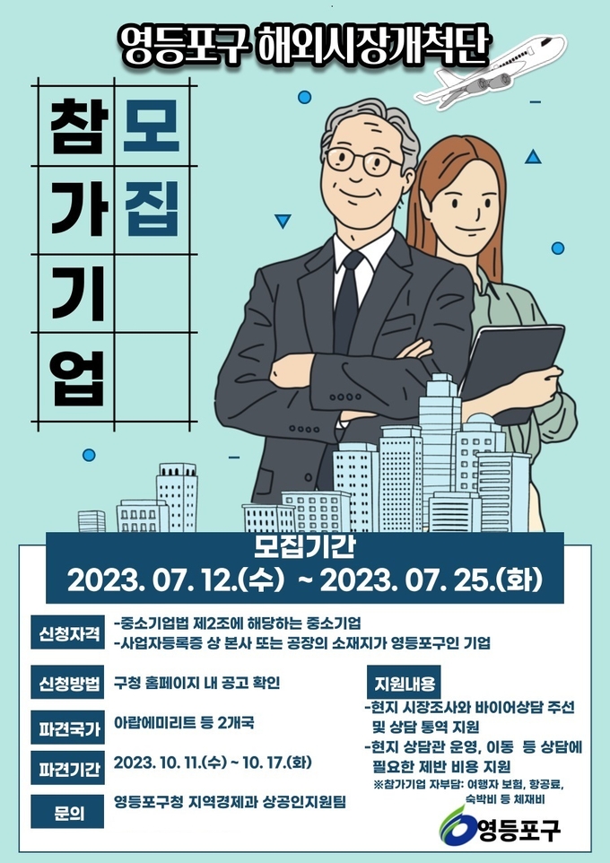 [영등포신문=변윤수 기자] 영등포구가 지역 내 중소기업을 대상으로 해외시장 판로개척과 수출 경쟁력 강화를 위해 2023 영등포구 해외시장개척단 참가 기업 10개사를 모집한다고 밝혔다.