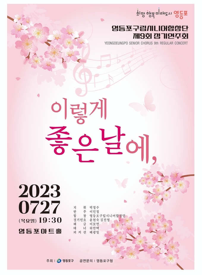 김형성 문화체육과장은 “제2의 인생을 노래와 예술에 대한 열정으로 꽃피우고 있는 시니어합창단이 준비한 공연에 많은 관심과 참여를 부탁드린다”며 “문화도시 영등포에서 다채로운 문화 예술도 경험하시고 가족, 연인 간 행복한 추억도 쌓으시길 바란다”고 밝혔다.
