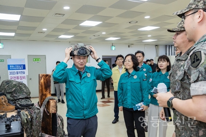 [영등포신문=이천용 기자] 최호권 구청장이 23일 오후 2시 북한의 미사일 도발 등 공습대비 민방위 훈련을 마치고, 구청 지하 2층에서 열린 ‘군전투장비 전시회’에 참여했다.