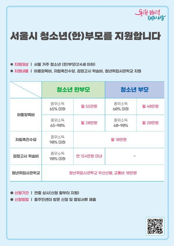 ‘청소년부모’는 자녀를 양육하는 부모가 모두 청소년(24세 이하)인 경우를 말하고, ‘청소년한부모’는 24세 이하의 모 또는 부를 말한다. 기존 청소년(한)부모 가정 지원은 저소득 가정을 대상으로 해왔지만, 서울시에서는 이른 나이에 준비가 부족한 상태에서 부모가 되었다는 점에 정책의 중점을 두고 소득 기준을 낮춰 지원대상을 확대한다.
