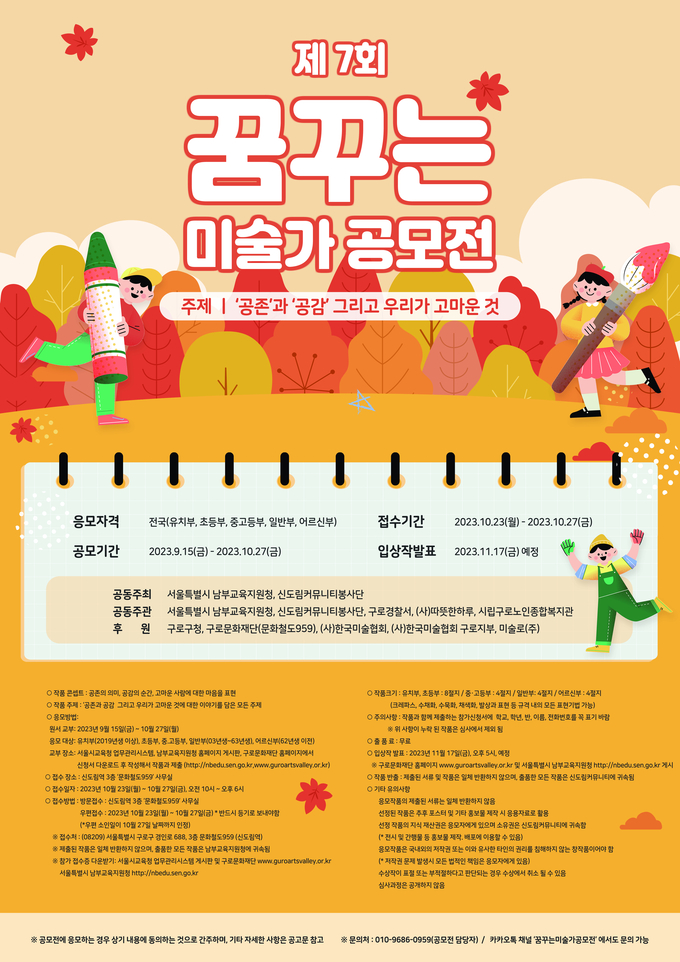 ‘제7회 꿈꾸는 미술가 공모전’은 미술전을 통해 유치원, 초등학생부터 중학생, 고등학생 그리고 성인 및 어르신에 이르기까지 우리 사회 구성원 모두에게 건전한 여가활동 기회 및 소통과 대화가 있는 평생학습(문화예술) 기회를 제공하고자 추진하게 됐다.