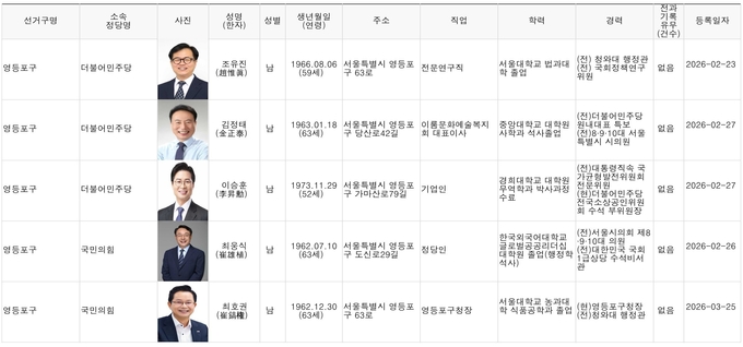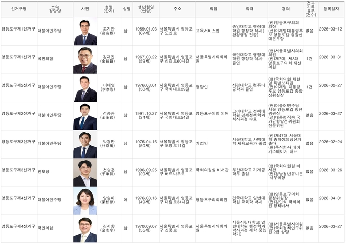 [영등포신문=이천용 기자] 오는 6월 3일 실시되는 제9회 전국동시지방선거에 출마하기 위해 영등포구선거관리위원회에 등록한 영등포지역 구청장, 시·구의원 예비후보 현황은 아래와 같다. (2026년 4월 2일 오후 2시 현재)