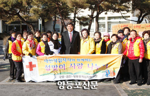대한적십자사 구로·금천·영등포봉사관(관장 이미영)은 20일 영등포구청 광장에서 관내 불우이웃을 위한 설 구호품을 전달했다.이날 자리에는 조길형 구청장을 비롯한 적십자 봉사원 30여명이 참석한 가운데 사랑의 쌀(10kg) 340포와 라면 340박스가 전달돼 각 동 소외계층에게 전해졌다. / 이혜영 주부기자