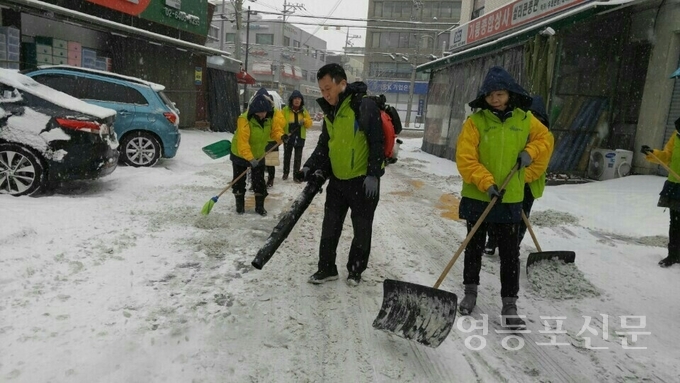 [영등포신문=장남선 주부기자] 대림3동 자율방재단 김종배 단장은 폭설이 내린 지난 18일 동 직원 및 회원 20여명과 함께 관내 노인정 주변과 비탈길 등에 쌓인 눈을 치웠다.