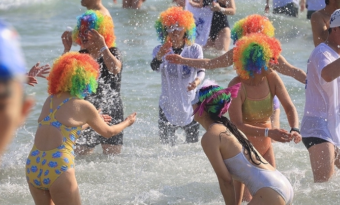[영등포신문=신민수 기자] 18일 부산 해운대해수욕장에서 열린 '해운대 북극곰축제'에서 참가자들이 겨울 바다에 뛰어들고 있다.