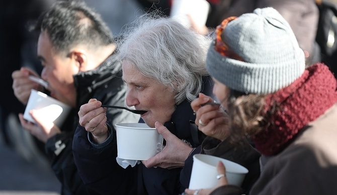 [영등포신문=변윤수 기자] 17일 중구 남산한옥마을에서 열린 '2026 남산골 설축제'에서 외국인 관광객들이 떡국 나눔 행사에서 받은 떡국을 먹고 있다.