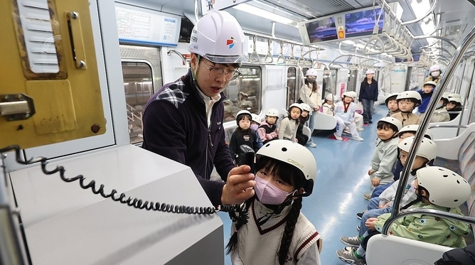 [영등포신문=나재희 기자] 25일 인천 계양구 인천교통공사 귤현차량기지에서 실시된 신학기 맞이 전동차 안전체험에 참여한 초등학생들이 전동차 비상시 행동 요령을 체험하고 있다.