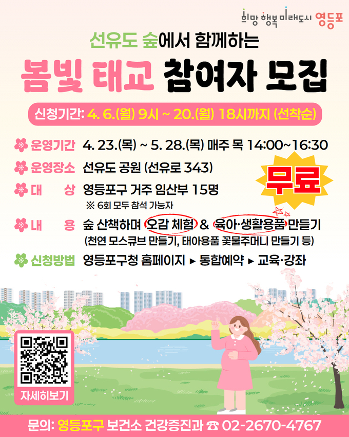 [영등포신문=변윤수 기자] 영등포구가 임산부의 정서적, 심리적 안정과 태아와의 교감을 돕기 위해 선유도 공원 숲에서 진행되는 ‘봄빛 태교’ 프로그램 참여자를 모집한다.