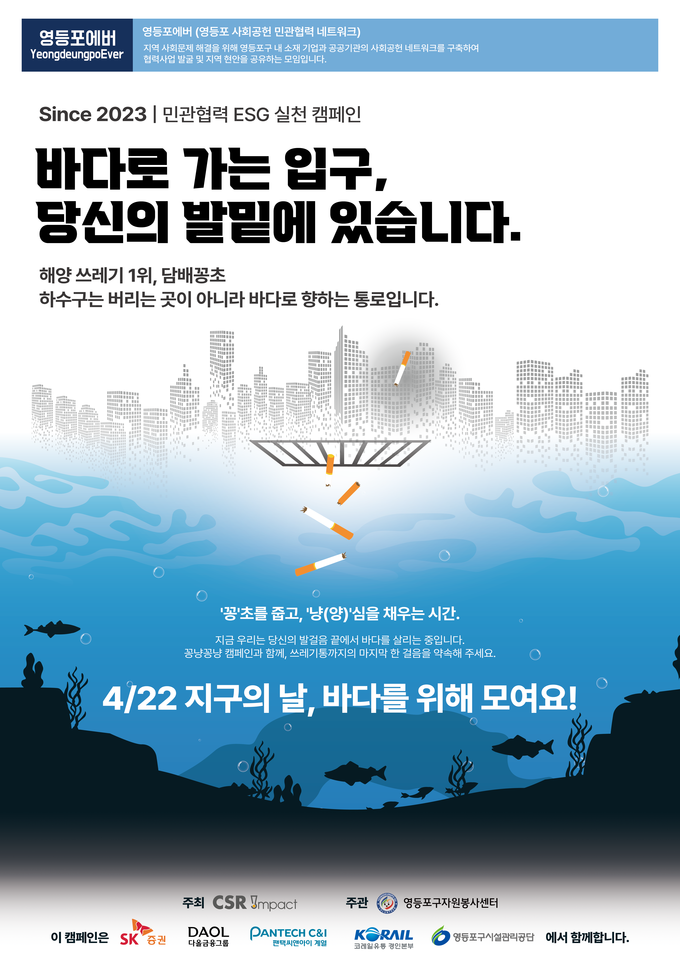 [영등포신문=이민경 시민기자] 영등포구 사회공헌 민관협력 네트워크 ‘영등포에버’는 지난 22일 ‘지구의 날’을 맞아 여의도 도심 빗물받이 정화를 위한 ‘꽁냥꽁냥 캠페인’을 성공적으로 마무리했다.