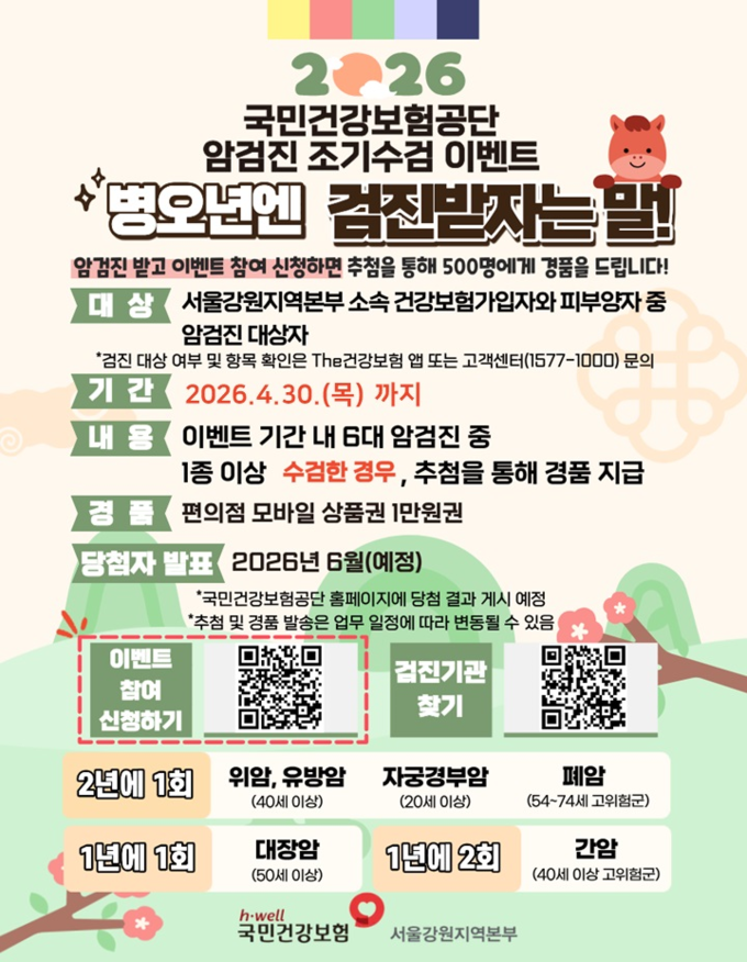 대상은 서울강원지역 소속 건강보험 가입자와 피부양자 중 암 검진 대상자이다. 방법은 이벤트 기간 동안 6대 암(위암, 유방암, 자궁경부암, 폐암, 대장암, 간암) 검진 중 1종 이상 수검하고 QR코드 또는 공단에서 발송한 알림톡의 참여하기 버튼으로 참여할 수 있다. 다만 암 검진 대상자가 이벤트 기간 내에 암 검진을 받고 이벤트 참여 신청해야 추첨 대상이 된다.