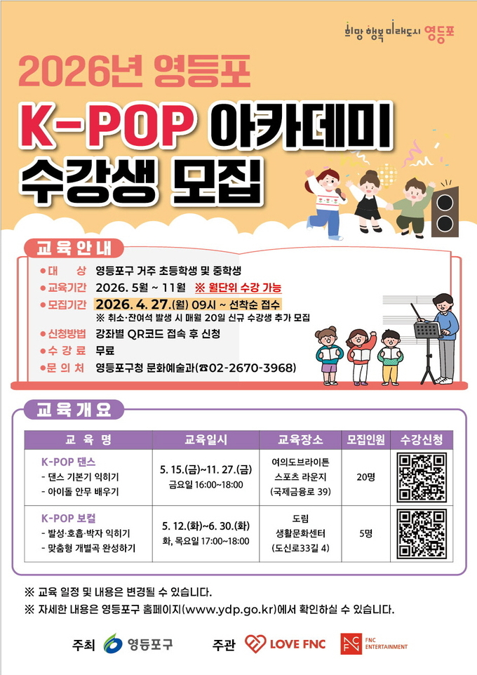 이번 프로그램은 영등포구와 FNC엔터테인먼트의 비영리 공익재단인 ‘LOVE FNC’가 공동 기획한 K-컬처 기반 문화예술 교육이다. 청소년들이 안무 습득과 보컬 훈련을 통해 자기표현 능력을 키우고 정서적 성취감을 얻을 수 있도록 구성했다.