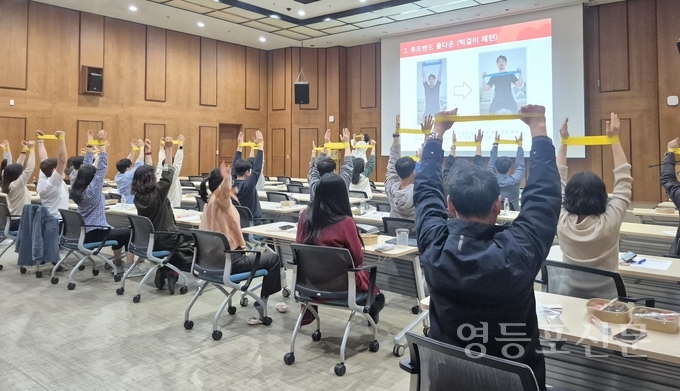 이 강좌는 대사증후군과 만성질환, 근골격계 관리에 취약한 사업장 근로자를 대상으로 영등포남부지사 한은복 운동지도사의 운동‧영양 강의와 스트레칭 및 근력 운동방법 등 실습위주로 진행됐다.